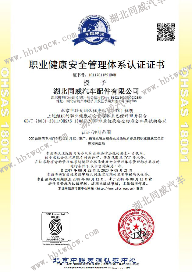 湖北同威汽車配件有限公司通過9001管理體系認證,其中包括職業(yè)健康安全管理體系認證證書,質(zhì)量體系管理認證證書,環(huán)境管理體系認證證書。