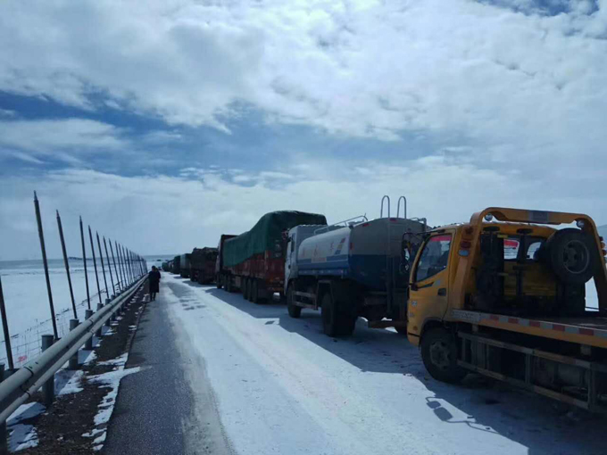 10月30日,司機(jī)抵達(dá)格爾木,繼續(xù)往前進(jìn)入唐古拉山。青藏線唐古拉段因?yàn)橄麓笱壳霸斐陕愤吔Y(jié)冰。由于道路狹窄,數(shù)百輛卡車被堵在路上,情況緊急。由于唐古拉段海拔高,氣溫低,卡車司機(jī)只能使用車輛只有的暖風(fēng)系統(tǒng)進(jìn)行取暖。但是由于堵車時(shí)間長,部分車輛已經(jīng)出現(xiàn)柴油不足的情況。部分司機(jī)車內(nèi)已經(jīng)沒有食物,更有甚者出現(xiàn)無法取暖的情況,據(jù)卡友透露,已經(jīng)有部分司機(jī)出現(xiàn)高反,情況十分危急。
