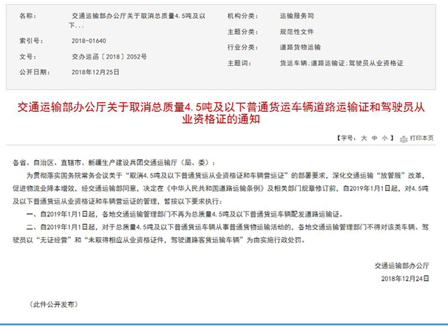 一、自2019年1月1日起,各地交通運輸管理部門不再為總質(zhì)量4.5噸及以下普通貨運車輛配發(fā)道路運輸證。