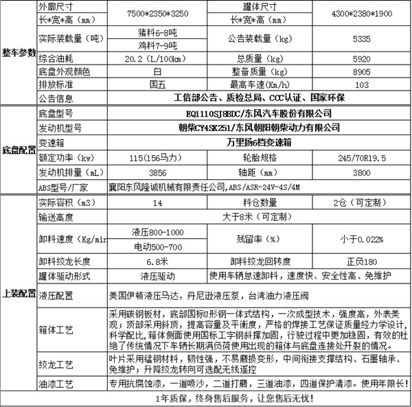 | 罐體外形尺寸:4800×2300×1850(mm);罐體有效容積:11.2立方米;隨底盤選裝駕駛室.1.防護(hù)材料:Q235,連接方式:側(cè)/后防護(hù)材料為Q235,均為焊接連接;后防護(hù)截面尺寸230×60mm,下邊緣離地高450mm;2.后伸量:200mm;3.采用CY4SK251,ISF3.8s5154,YC4S150-50,4DX23-140E5,YN38CRE1發(fā)動機(jī),油耗值分別為(L/100km):23.6,24.0,24.2,24.8,24.7;4.ABS系統(tǒng)生產(chǎn)廠家,型號 :襄陽東風(fēng)隆誠機(jī)械有限責(zé)任公司,ABS/ASR-24V-4S/4M;5.該車專用裝置為絞龍,用于運(yùn)輸散裝飼料.選裝電動輸料系統(tǒng)結(jié)構(gòu). |